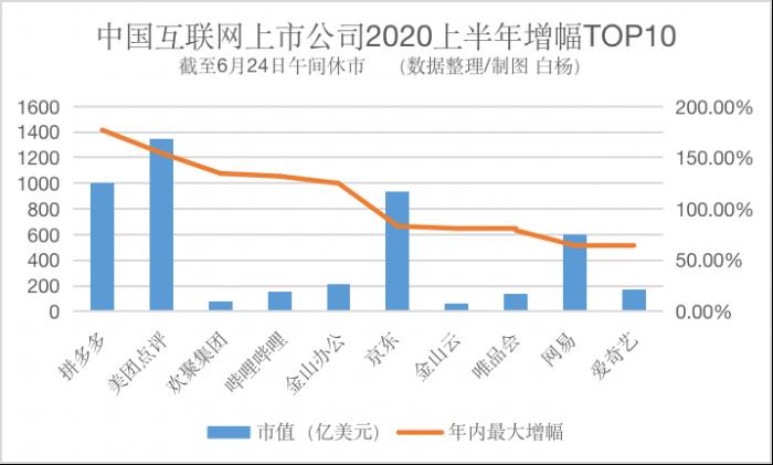 抛开市值排名,每个互联网公司这半年的境遇也有所不同。据21世纪经济报道统计,若按照目前股价较年内最低点的涨幅来排名,TOP10的企业分别是拼多多176.95%、美团点评154.49%、欢聚集团134.65%、哔哩哔哩131.90%、金山办公124.99%、京东83.24%、金山云81.01%、唯品会79.10%、网易64.36%、爱奇艺63.68%。
