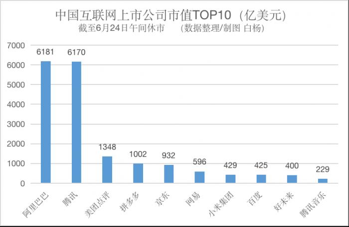 截至6月24日A股及港股午间休市,中国互联网上市公司市值的TOP10分别是阿里巴巴6181亿美元、腾讯6170亿美元、美团点评1348亿美元、拼多多1002亿美元、京东932亿美元、网易596亿美元、小米429亿美元、百度425亿美元、好未来400亿美元、腾讯音乐22亿美元。