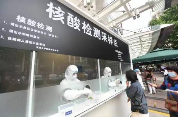 一周前,在复旦大学附属中山医院西院入口处,已有一排新落成的鼻咽拭子采样亭。这批采样亭设置了传递窗体和采样窗体,医护人员的双手可以穿出采样口进行采样,在传递窗体上设有传递口,用于传递医保卡、条码等物品。同时,采样亭里还具有双锁和监控的冰箱来临时保存标本。
