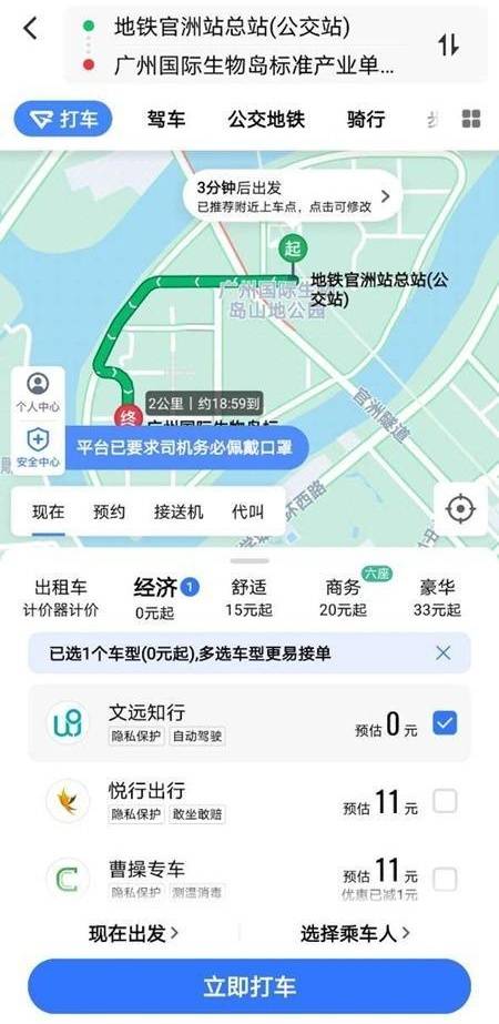 即日起,身处广州的乘客,通过高德打车可以一键呼叫无人车,首月免费乘坐。
