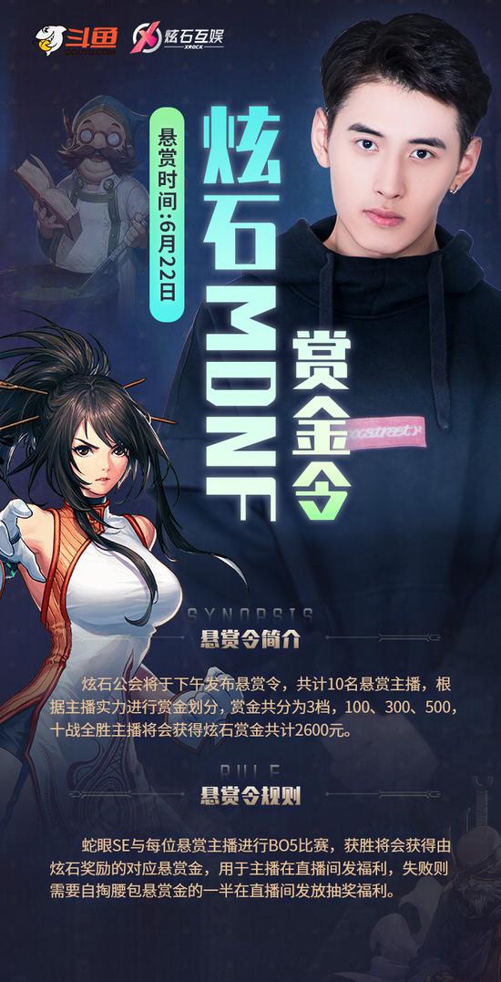 首播当天,炫石专门为蛇眼打造了赏金令活动,赏金令共计10名悬赏主播,根据主播实力进行赏金划分,赏金共分为3档,100、300、500,十战全胜蛇眼SE将会获得炫石赏金共计2600元,用于直播间发福利,失败则需要自掏腰包悬赏金的一半在直播间发放抽奖福利。