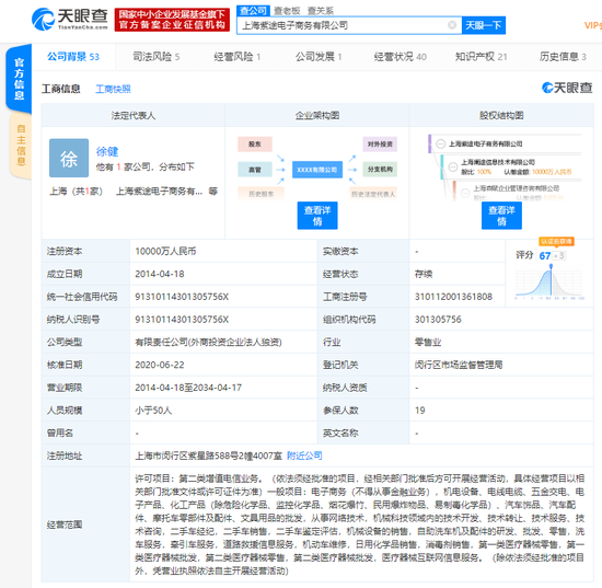 天眼查数据显示,上海紫途电子商务有限公司成立于2014年4月,经营范围包括第二类增值电信业务;电子商务(不得从事金融业务),二手车经纪,二手车销售,二手车鉴定评估,机械设备的销售等。该公司由途虎养车的关联公司上海阑途信息技术有限公司全资持股。