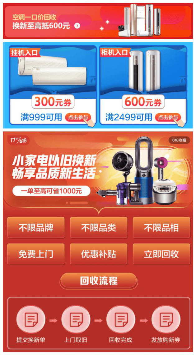 为进一步提升服务体验,引导消费者关注家电安全使用年限和节能环保消费,在刚刚结束的本届618大促期间,京东更打造了“以旧换新折上折”、“空调一口价”、“小家电以旧换新”等多种促销活动。其中,“以旧换新折上折”包括了空调、洗衣机等几乎所有居家必备家电,不仅活动期间回收价格多补贴10%,还额外赠送了可购买全品类家电、叠加全部优惠的“超级支付95折券”,用券后最高能抵1000元。“空调一口价”则更加简单直接,所有空调产品不论品相、品牌、年限,无需估价,挂机一律补贴300元,柜机一律补贴600元,且提供免费拆机和极速下单的增值服务。值得一提的是,小家电今年也加入了“以旧换新”活动中,而通过物流优势,京东的“送取同步”模式也实现了一次下单、一次上门,直接满足消费者取旧、优惠、送新的一站式需求。