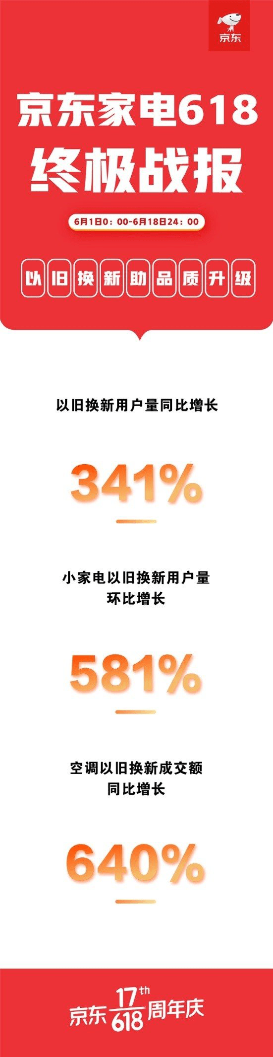 战报数据显示,截至6月18日24时,家电换新用户量同比341%;小家电以旧换新用户量环比增长581%;空调以旧换新用户同比增长585%,换新销售额同比640%;京东家电向消费者补贴安装费超过1亿元。可以说,在京东平台的有力助推下,消费者以旧换新的消费热情一触即发,而这无疑也成为推动家电市场恢复性增长的强劲动力。