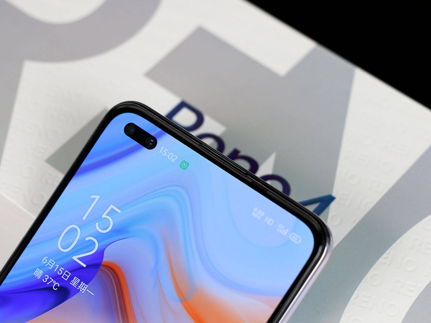 OPPO Reno4的这块6.4英寸的屏幕,也有着相当的设计感,熄屏时犹如悬浮在正面之上,亮屏后则可以看到屏幕挖孔。不过,其左上的挖孔区域为椭圆形,这也意味着该机配备了前置双摄。前置双摄能够提供实时的虚化效果,无论是自拍或是视频自拍,效果均能有所提升。