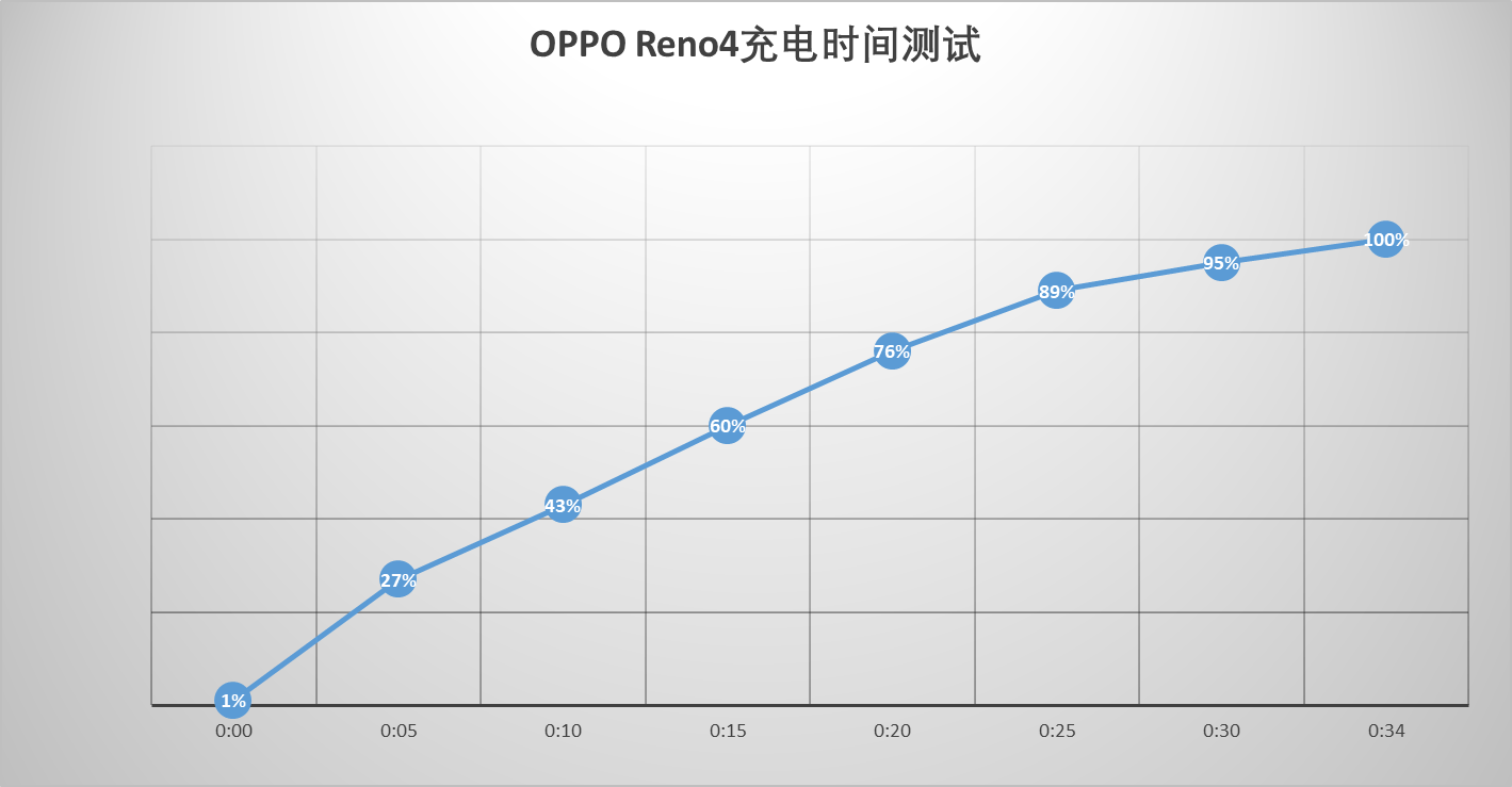全场景智能省电与超级省电模式,其实只是OPPO Reno4续航表现的一部分,Reno4所支持的65W超级闪充是续航上的另一个重要保障,也是该机续航体验的最重要组成部分。这种快充技术运用电池串联的特点,提供的依然是低压快充的解决方案,具有高速、高转化率的特点。同时,整机的立体VC液冷散热系统能够快速导出热量,确保高效散热,进而保证充电效率。经过我们实测,OPPO Reno4从1%的低电量充至100%满电,总共耗时34分钟,充电效率极高。从充电曲线中看,低电量阶段的充电速度十分惊人,5分钟时间就能充电25%以上,足够满足高强度的续航需求。