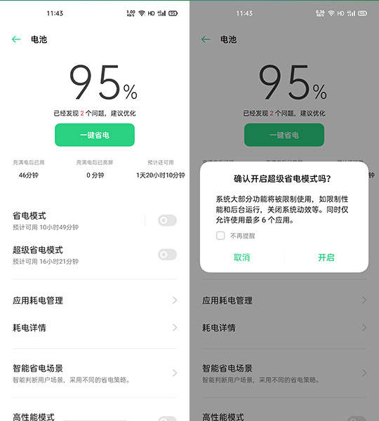 充足的电量与全场景智能省电的结合,能够有效保证OPPO Reno4的日常续航需求。经过我们实测,5小时的综合续航测试耗电43%,省电表现相当惊人了。对于该机的续航表现,我们显然无须担心。