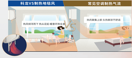 制热时开启地毯风,暖气流更广、更集中沿着墙面向地板区域输送,制热效果更好,温度更均匀更舒适,打破了传统空调头热脚凉的制暖瓶颈。真正为消费者带来了“风不直吹、冷暖效果不损失”的送风体验。