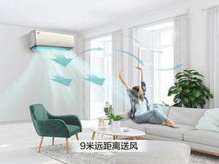 科龙VS挂机在强劲风幕模式下,上导风板水平下摆7度,下导风板水平下摆25度,强风喷射而出,实现最远长达9米的远距离送风。即使在客餐厅一体的开阔空间,也能实现全屋各个角落温度均匀。VS强劲风幕,有效解决空调附近空间温度与远处空间温度不一致的痛点。