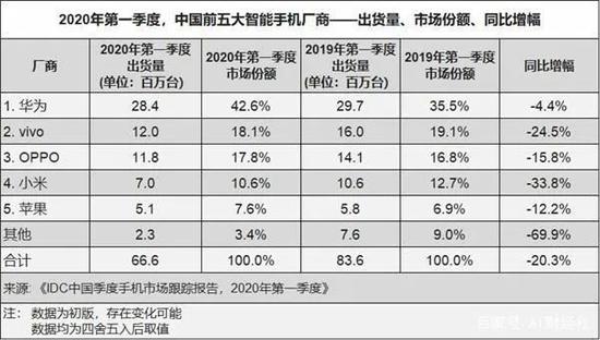 IDC发布的一季度中国智能手机出货报告同样显示,华为以42.6%的市场份额排名第一,vivo(18.1%)、OPPO(17.8%)分列二、三位。小米以10.6%的份额位列第四,苹果第五,份额为7.6%。而魅族被归为其他品牌,一季度总体市场份额不足华为的十分之一。