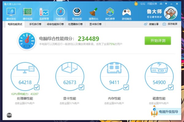 联想小新15 2020跑分234489分,处理器性能64218分,显卡性能62673分,内存性能为9411分,磁盘性能54900分。