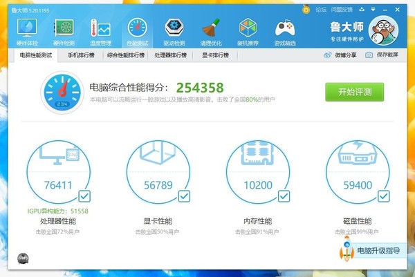 同时为了让两者性能表现更为直观,我还用鲁大师对这两款笔记本电脑进行跑分测试,其中荣耀MagicBook Pro 2020跑分为254358分,处理器性能76411分,显卡性能56789分,内存性能10200分,磁盘性能为59400分。