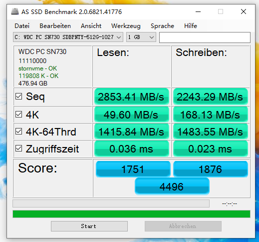 在AS SSD Benchmark测速中,荣耀MagicBook Pro 2020固态硬盘得到了4496分的高分,顺序写入和读取速度分别达到了2853.41MB/s和2243.29MB/s,访问读取时间为0.036ms,访问写入时间为0.023ms。