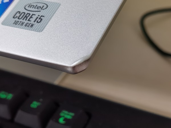 事实证明,我没有吸取之前的教训。我试图将键盘置于桌面边缘与我的腹部之间,营造出一个可以代表生产力的斜率,但是由于桌面边缘太滑,一记不慎,键盘掉了。但是键盘并没有落地,依靠电脑的USB接口紧紧的悬挂在空中,真是令人感叹。当时键盘上的USB接口部分出现了一定的形变,不过接口本身依然可以正常工作,将键盘归位后,接口形状恢复正常,没有变成奇怪的形状。此前,这种事情也曾发生在我的联想小新15 2020上,结果与荣耀相同,只不过由于是塑料机身,因此形变的程度会更大一些。
