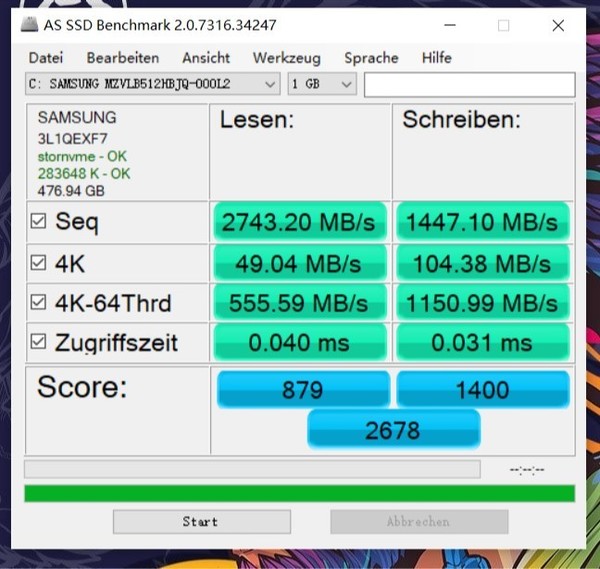 而联想在这方面稍逊一筹,小新15 2020的固态硬盘得分2678分,顺序写入和读取速度分别达到了2743.20MB/s和1447.10MB/s,访问读取时间为0.040ms,访问写入时间为0.031ms。