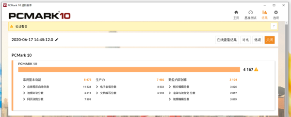 在综合性能方面,我用PCmark 10进行测试,荣耀MagicBook Pro 2020得分4167分,其中常用基本功能得分8475分,生产力7466分,数位内容创作得分3104。就轻薄本而言,这样的跑分结果相当不错,日常操作运行流畅,完全可以应对现在的办公软件及其大量文字、表格内容,同时还能完成基本的PS、PR等专业工具操作。