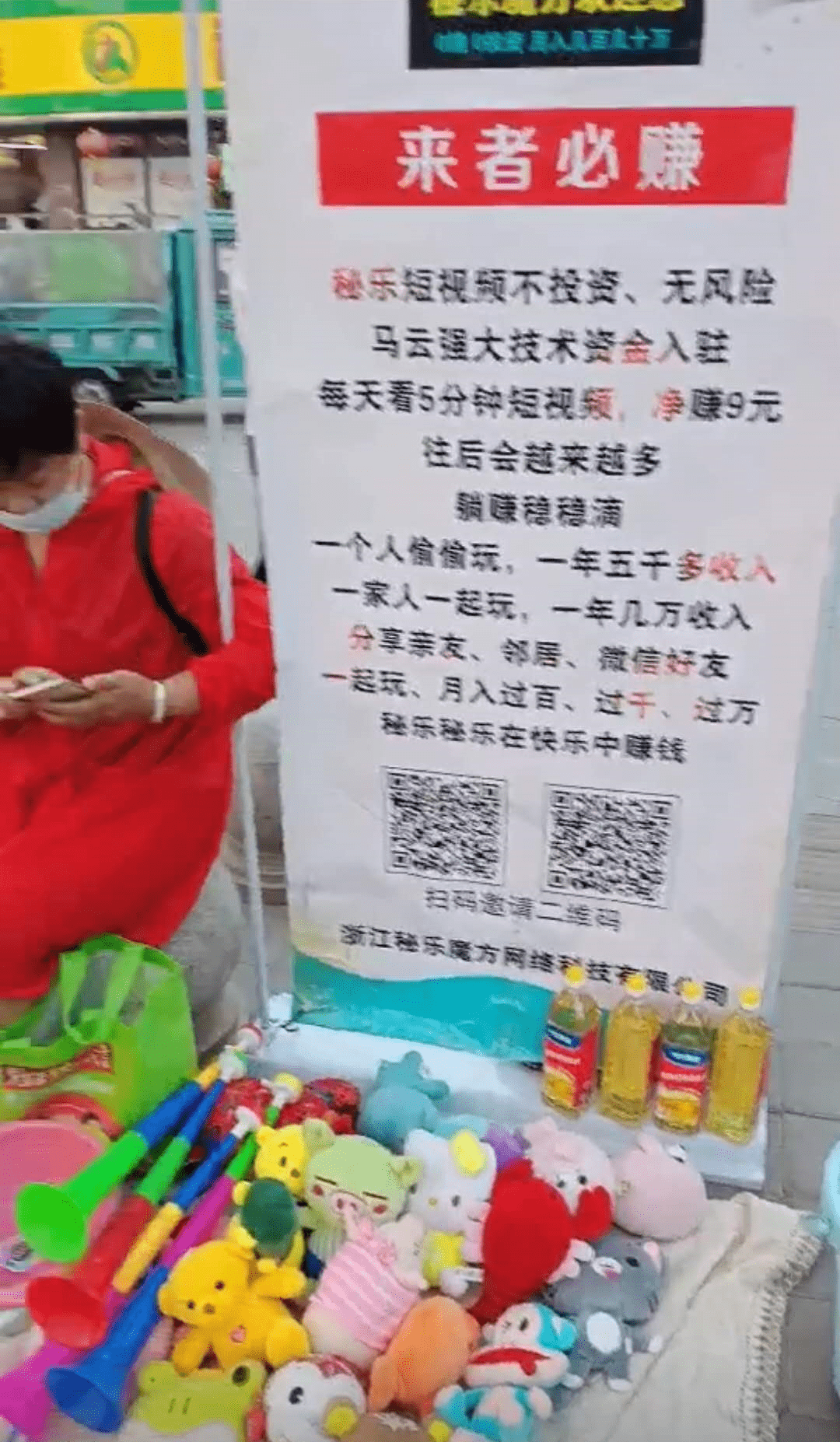“每天看五分钟视频就能赚钱,按照现在的发展趋势,秘乐就是下一个抖音。”6月12日,戴着印有秘乐短视频LOGO的红色帽子,在市场上摆摊地推的辰姐告诉新京报记者。
