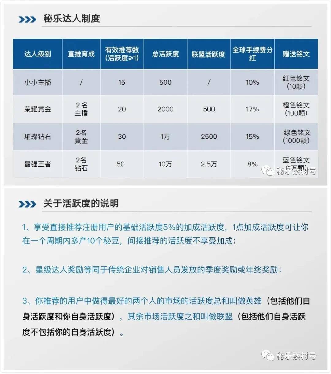 “辰姐”介绍,秘乐有“达人制度”,“一开始的免费任务给的分成较少只有几百块,但只要你的推荐数、活跃度足够高,可以成为‘主播’,往后还有‘荣耀黄金’、‘璀璨钻石’、‘最强王者’级别。”记者所在秘乐“交流群”的“导师”则表示,主播每年的分红收入不会低于20万,黄金、钻石、王者的分红收入则不会低于100万、500万和2000万。
