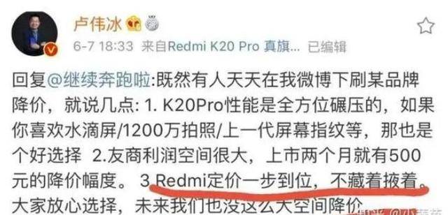 还有网友还特意翻出了红米总经理卢伟冰此前怼友商的承诺,其曾表示,"Redmi定价一步到位,不藏着掖着,大家放心选择,未来我们也没有这么大的降价空间。"