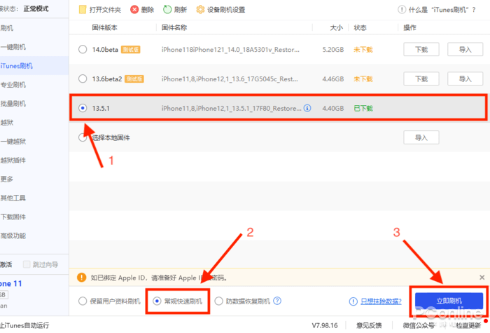 下一步,你需要首先在刷机越狱这一栏找到你刚刚下载的iOS 13.5.1的固件包并勾选它常规快速刷机(如果选择保留用户资料刷机的话将会有很大几率刷机失败,导致你的iPhone变砖),再之后就点击软件右下方的立即刷机即可。