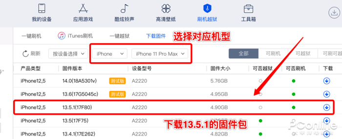 刷机越狱,进入后先选择你的机型,之后选择13.5.1(17F80)这个固件包点击下载按钮。