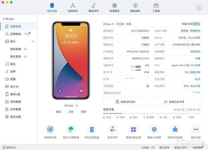 接下来,你需要使用苹果的原装数据线或经过官方认证的第三方数据线连接到电脑(如果你的电脑没有驱动的话,可能要先按照软件提示安装驱动),连接后你可以在我的设备这一栏看到你的iPhone相关信息。