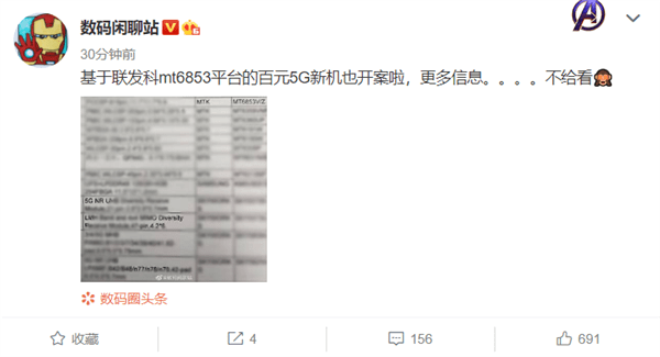 原标题:百元5G手机不远了 爆料称联发科MT6853新机已开案