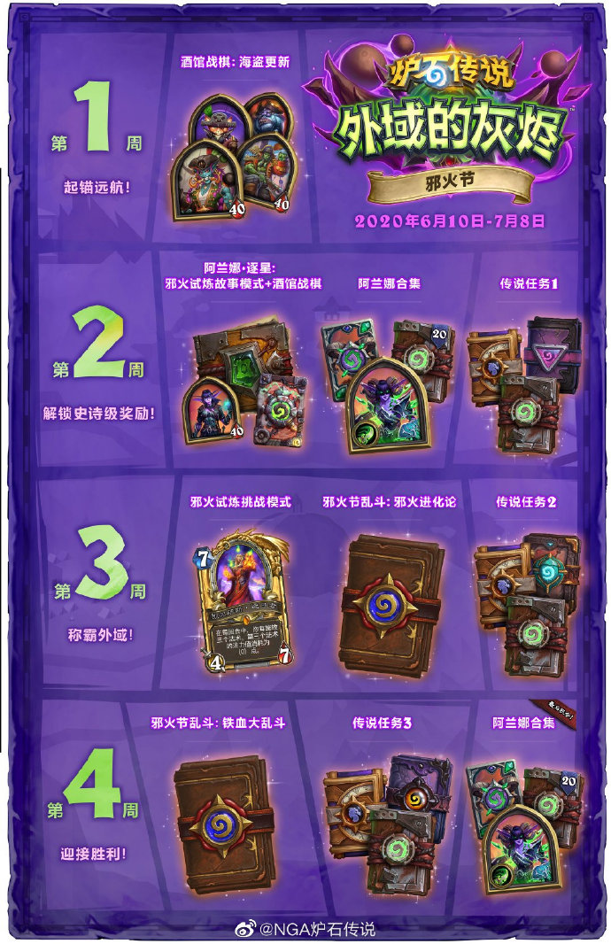于6月25日刷新,完成4场邪火试炼挑战模式对战,便可获得1包 “外域的灰烬” 卡牌包,1包巨龙年卡牌包,以及1包 “奥丹姆奇兵” 卡牌包。