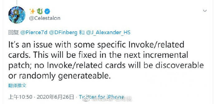 Celestalon:由于一些特定的祈求/祈求相关卡造成了问题,我们将在下个补丁中修复这些bug。未来所有祈求或与之相关的卡都将不能通过发现或随机生成等方式获取。
