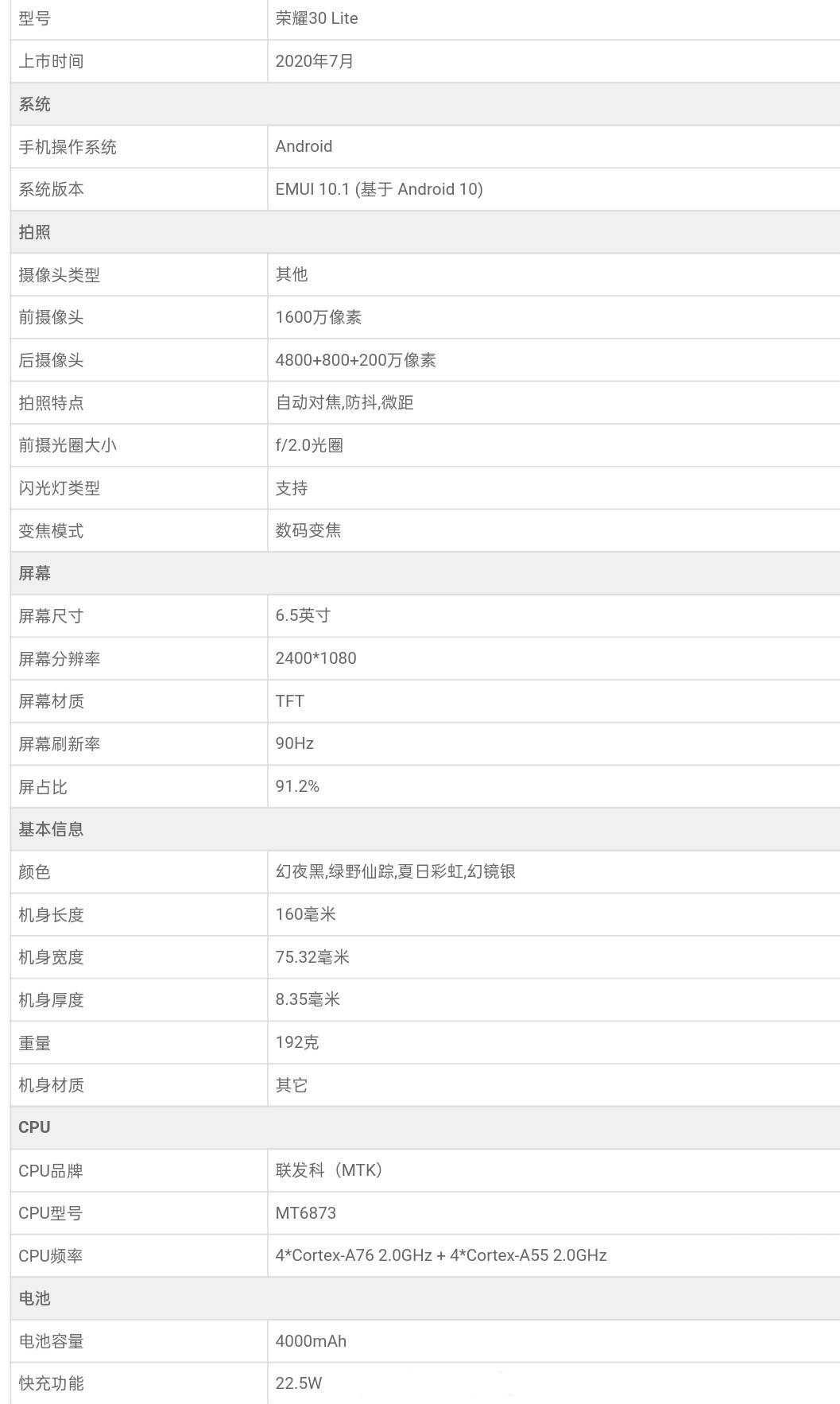 根据爆料,荣耀 30 青春版将采用水滴屏设计,配备一块 6.5 英寸、2400 × 1080 分辨率、90Hz 刷新率的 LCD 屏,采用侧边电容式指纹识别;搭载联发科天玑 800 5G SoC,内置 4000mAh 电池,支持 22.5W 快充;后置 4800 万 + 800 万 + 200 万三摄方案,前置 1600 万像素镜头。