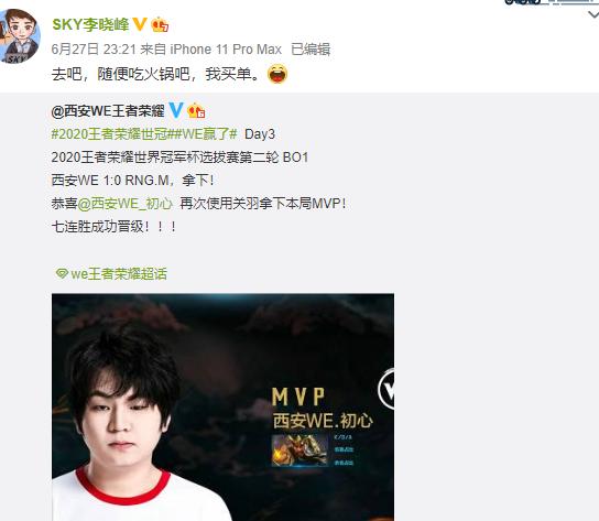 有这么好的表现,更是提前晋级了,老板SKY肯定是要好好奖励一下的,这不,SKY也是霸气发话了,火锅随便吃,我买单。关键是这随便二字,WE小伙子们放开肚子吃吧,买单那肯定是老板的事情,小伙子们值得奖励。