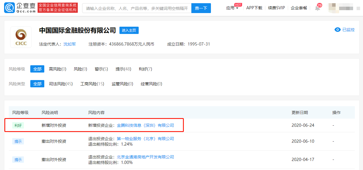 新京报贝壳财经讯 6月28日,据企查查显示,6月24日,中国国际金融股份有限公司(港股简称:中金公司 03908.HK)与腾讯数码(深圳)有限公司成立金腾科技信息(深圳)有限公司,其中,中金公司持股51%为大股东。金腾科技法定代表人为闫敏,注册资本为5亿人民币,所属行业为软件和信息技术服务业,经营范围为软件开发;信息系统集成服务;信息系统运行维护服务;数据处理服务;互联网数据服务;信息技术咨询服务;计算机系统服务;数据处理和存储支持服务。
