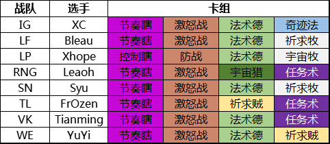 本周依然是瞎、战、德占据主流,大部分选手的第四套构筑都在任务术、祈求牧以及祈求贼中做出了选择。不过所有选手中最特殊的还要属LP的Xhope,四套卡组中只有一套法术德较为主流,是一套标准的蓝龙的,其余的三套卡组都偏向防守,分别是最近较流行的控制瞎、防战以及宇宙牧。而除此之外IG的XC其第四套卡组选择了一套奇迹法也是一大看点。