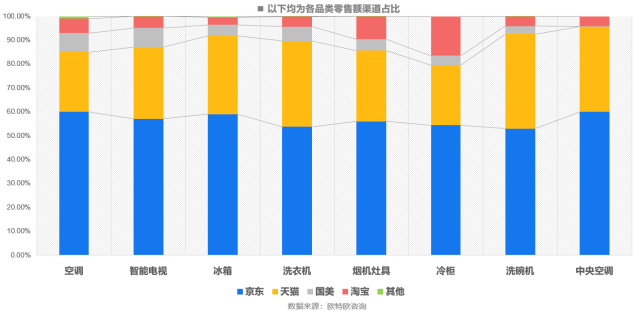 此外,618大促正值全国气温升高和大家电换季期,叠加因疫情延后的装修需求,以智能电视、冰箱、空调、洗衣机为主的大家电成为热门销售品类。其中京东依然是表现优异,各大品类的渠道占比均领先业界。