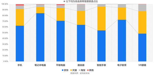 数据显示,京东在手机、各类电脑及外设、智能手表及其它穿戴设备等品类的渠道占比明显占据绝对优势。