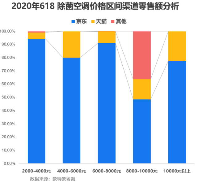 此外,后疫情时代空气净化器、除菌空调技术功能全面升级,高端健康已成为人们日益重视的新兴消费领域。《报告》指出,从2020年618空气净化器和除菌空调的价格区间渠道零售额分析来看,10000元以上除菌空调京东渠道占比较高,超过75%。
