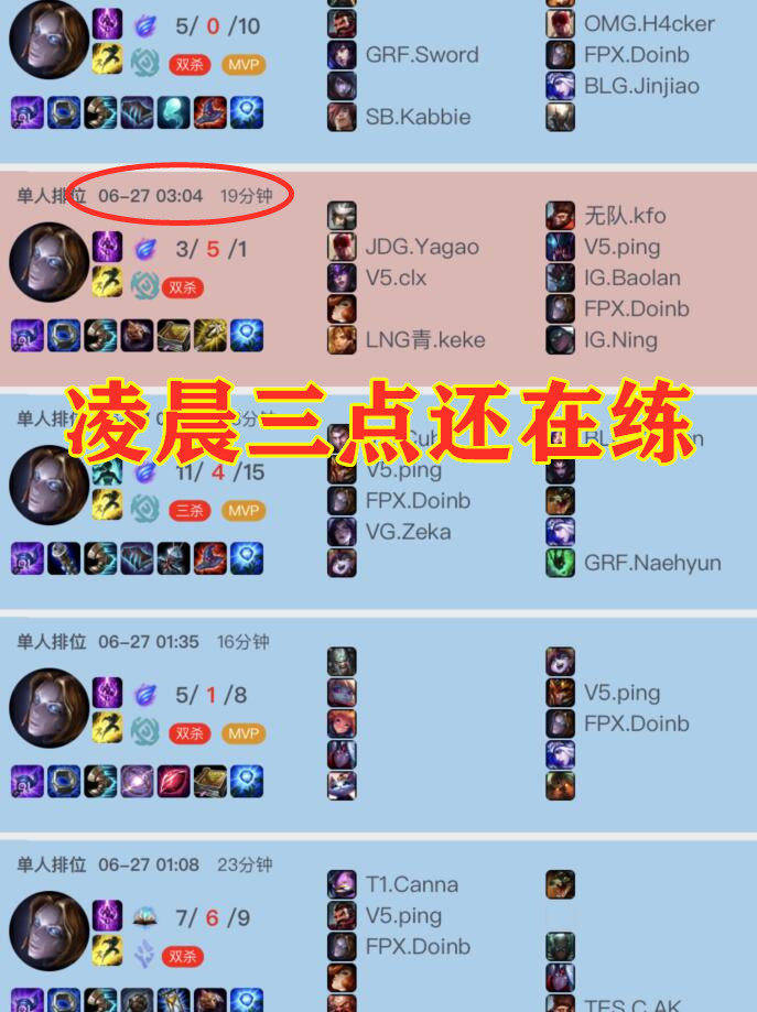 只不过doinb为了能够赢比赛,真的是太疯狂了,因为之前的比赛中,练了几十场的稻草人没能够赢下比赛,导致他对稻草人这个英雄彻底失望,结果才来练的发条。而且就在比赛的前一天晚上,doinb开始疯狂地练了好几场发条,并且有一场还是发生在凌晨3点,要知道第二天可是有比赛,不得不说doinb这么拼,难怪ES会打不过。