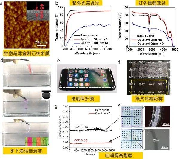 图.(a)45nm超薄金刚石纳米膜;(b)50和100纳米金刚石膜石英玻璃在紫外—可见光波段的透光率;(c)50和100纳米金刚石膜石英玻璃在红外波段的透光率;(d)粘附食用油的镀膜石英片在水下自清洁和水下油的接触角;(e)手机屏覆盖镀膜石英,白色虚线表示石英片边界;(f)无镀膜和镀膜石英片置于沸水之上,黄色虚线表示金刚石镀膜石英片边界;(g)无镀膜和镀膜石英表面的摩擦系数及划痕实验对比。