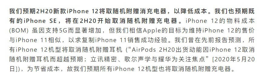 郭明錤称此举是因为今年 iPhone 12 由于支持 5G 使得物料成本显著增加,而苹果为了维持 iPhone 12 的售价与 iPhone 11 相近,以复制后者在销售上的成功,可能会选择取消随附充电器以降低成本。虽然郭明錤没有明确高端的 iPhone 12 Pro 是否也不再附赠充电头,但该报告称这种做法可能推广到未来所有新款 iPhone 上。