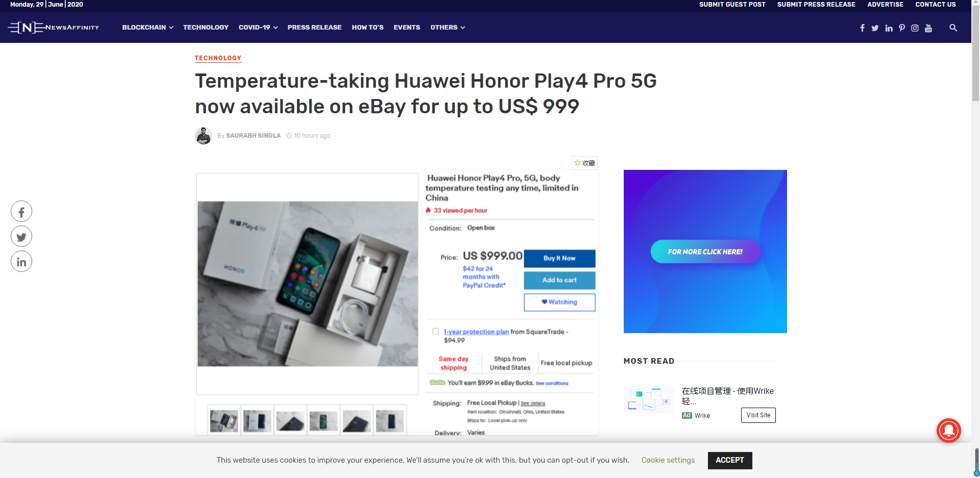 荣耀Play4系列一经发布就引起更多消费者的关注,其中最引人注目的无疑是其中的荣耀 Play4 Pro红外测温版。近日,有知名外媒news affinity报道称,这款手机被老外漂洋过海倒回美国,并在eBay上挂出了999美元的高价,与iPhone11还贵300刀,比国内价格贵出2倍不止,墙里开花墙外香,这款手机在国外居然火了。这款产品此前还被媒体Arstenchnica称为是“2020 年最 2020 的手机”。
