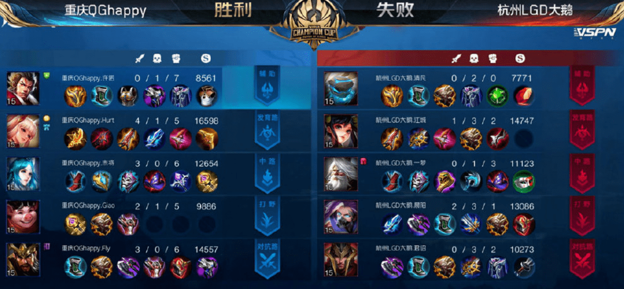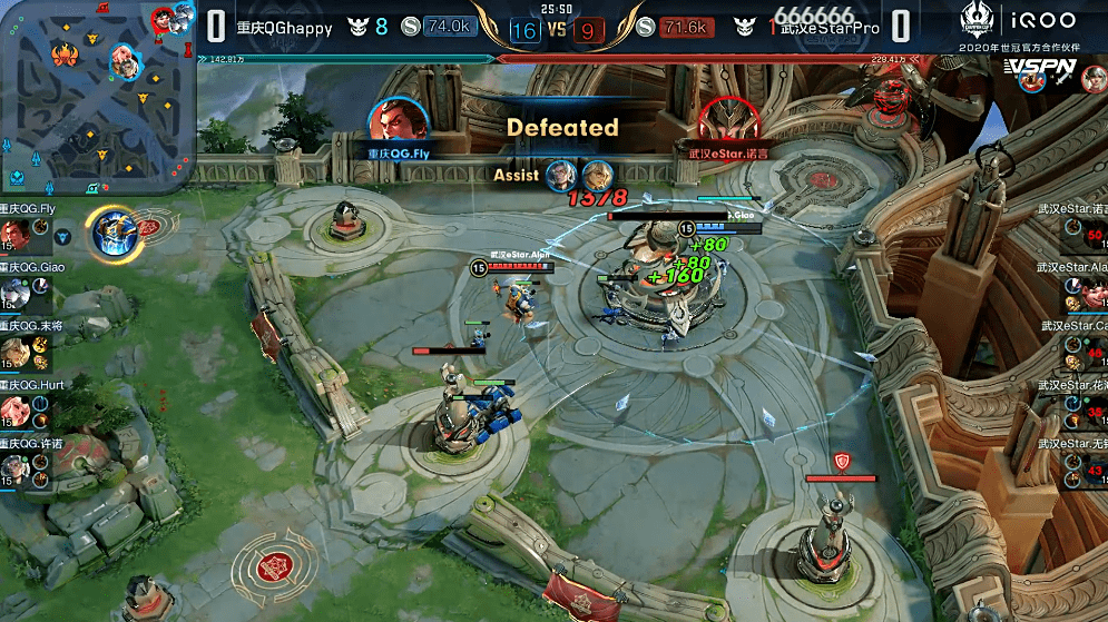 第9局是WE对战VSG,这场比赛对晋级没什么影响,所以双方也是打得比较奔放,WE开局就入侵蓝buff区拿到一血,但在后续入侵红buff区时候被反打,连死3人,不过他们没有放弃,继续用后羿的大招各种强开团,慢慢打了回来,决胜团中,虽然VSG的老夫子绑住了关羽,但WE就地反打, 切掉脆皮c位后团灭对手,拿下比赛,8胜1负收官。