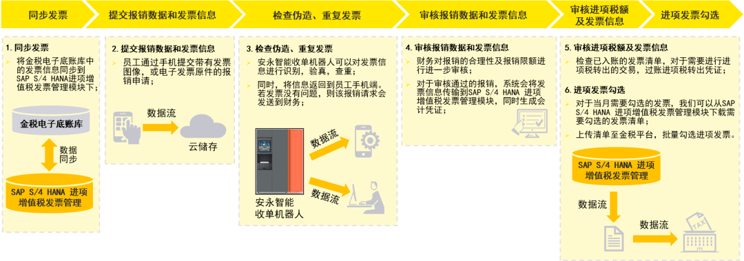 该解决方案集成了金税、差旅报销系统、安永智能收单机器人和SAP进项增值税发票管理功能,为差旅报销提供了端到端解决方案。