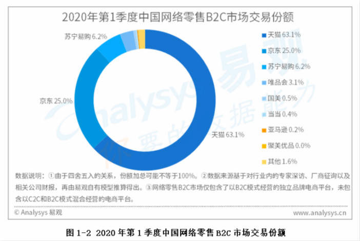 再看国美的主营业务,根据易观发布的《中国网络零售B2C市场季度监测报告2020年第1季度》数据显示,市场份额方面,2020年第1季度,天猫排名第一,占63.1%,京东以25%的份额排名第二,国美昔日老对手苏宁易购以6.2%的市场份额排第三。而国美在线市场份额仅0.5%,排名第5,与“老大”天猫之间隔着两个京东加两个苏宁的距离。