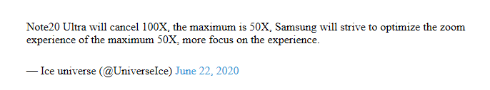 此外还有一份最新爆料,三星Galaxy Note 20 Ultra的变焦镜头的放大倍率上限为50倍,三星将努力优化最大50X的变焦体验,更加注重拍照体验。尽管三星拥有最的相机模块之一,但就手机拍照技术而言,Galaxy S20 Ultra与友商相比并没有给人留下深刻的印象。因此,三星将在实现高数倍变焦下,优先考虑改进其现有技术,并提供更好的摄影体验。