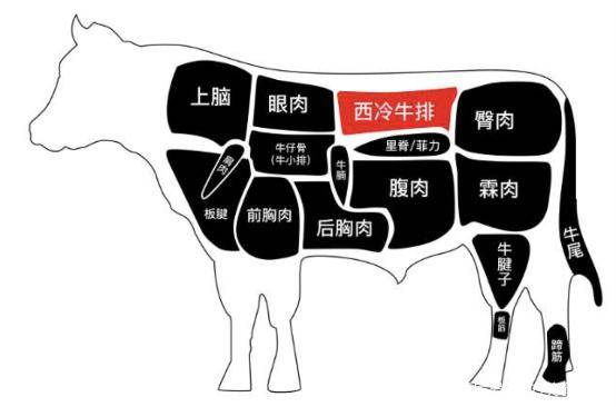 比如我们熟知的牛眼肉,就是从牛脊背两侧割下的肉,平均每头牛只能产3-5公斤牛眼肉。因为产量有限,所以采购成本更高,售价更贵,一份常见的澳洲进口的西冷牛排,每公斤售价就能超过200元,是拼接肉的两倍以上。