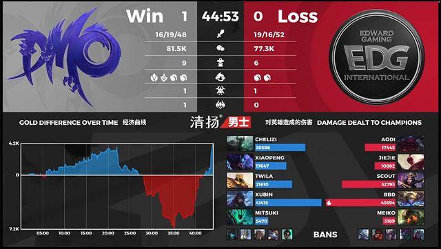 28-41分钟时EDG经济是领先的,其余时间DMO都是领先的。Ez打出了全场最高伤害,厄斐琉斯是DMO这边伤害最高的。