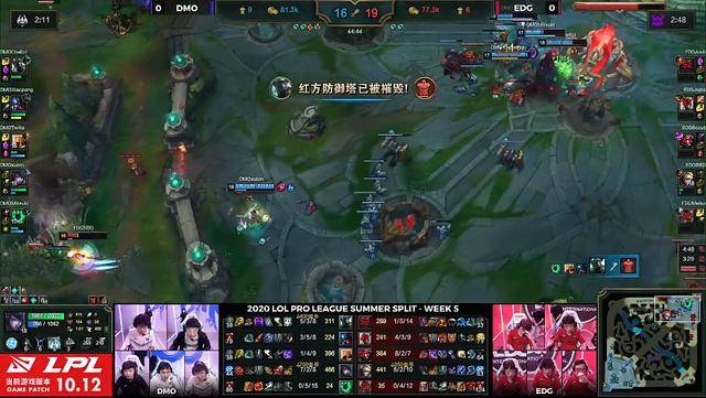 先阵亡一个辅助的情况下,EDG打出一波一换五,团灭DMO,中期找到了自己的节奏。