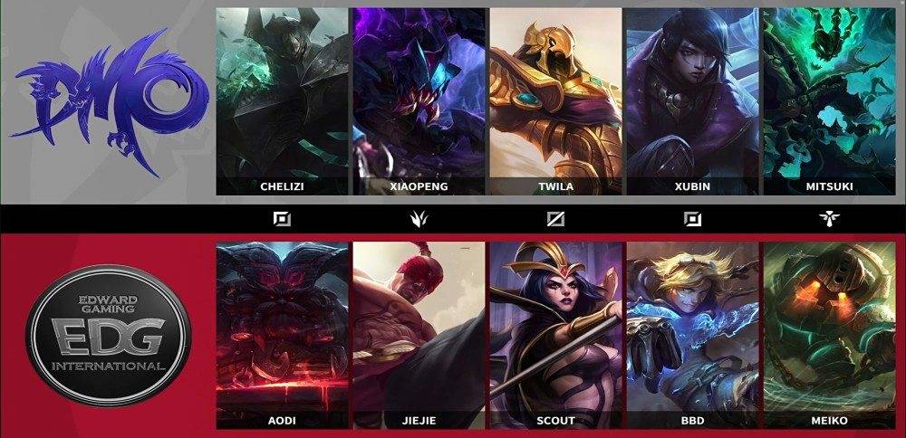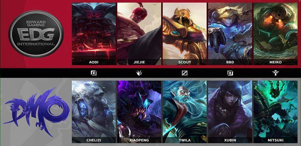 在第一局比赛中,DMO前期打野拿下了不少的优势,但中期一波团战,DMO锤石先手开团,但被EDG打了一波反手,中单乐芙兰收下三杀,局面被EDG打了回来。并再接下来的一波团战中,aodi的奥恩击飞四人,直接团灭DMO,顺势拿下大龙,但在后期上高地却被DMO打了回来,最后DMO在大龙加持下,一波团战直接带走了EDG。