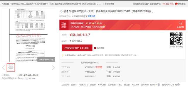 乐视网信息技术(北京)股份有限公司持有的1354项商标(其中五项已注销)在京东拍卖平台开拍,起拍价格为 136416.7 元。