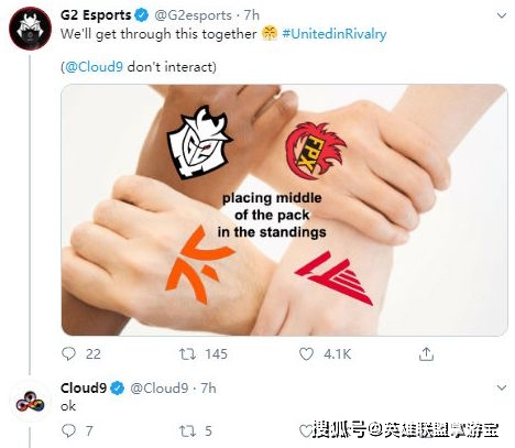 随后,他们还在推特中对C9开团,因为SKT、G2、FPX和FNC都排在联赛中游,于是G2表示“宝马赞助团”要齐心协力一起加油,但C9除外~